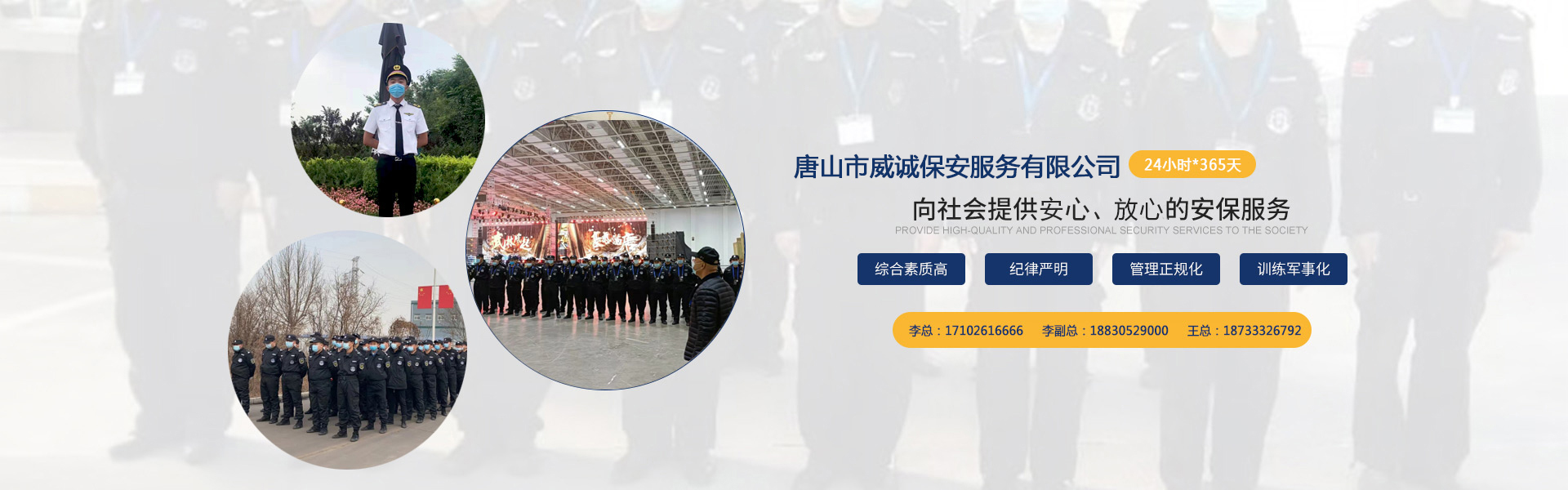 唐山市威誠保安服務有限公司自成立以來以“嚴防死守、忠于業主”為服務原則,以“客戶滿意、 合作共贏”為根本目標。以科學的管理、多方位多層次的服務,建立了首問責任制,完善了走訪、回訪 、滿意度調查、末位淘汰的預警管理,不斷提高服務質量,提高業主滿意度,提高企業形象。秉承“誠 實守信,紀律嚴明,團結協作,致精致誠”的服務理念,為客戶提供高品質、多方位、專業化的保安服務。 本公司制定了嚴謹的定向招生、崗前培訓、考核錄用、崗中培訓、持續培訓、末位淘汰制等一整套完善的管理體系。可以根據客戶的要求實地勘察評估,以量身定做的方式提供安保防范服務。